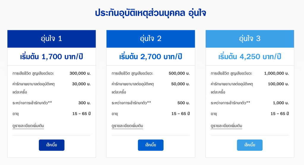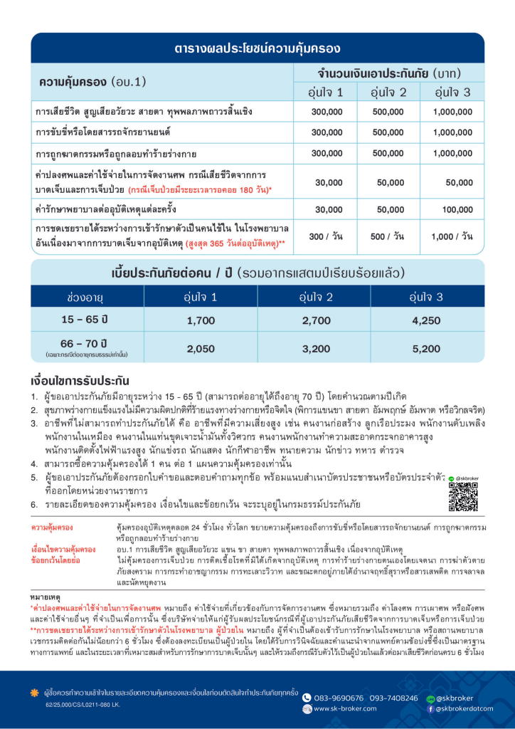 ตอบ ประกันอุบัติเหตุอุ่นใจ ครอบคลุมอุบัติเหตุตลอด 24 ชั่วโมง เบี้ยหลักพันคุ้มครองถึงหลักล้าน คุ้มครองค่ารักษาพยาบาลต่ออุบัติเหตุแต่ละครั้งสูงสุดถึง 100,000 บาท* แถมลูกหลานยังเบาใจมีค่าปลงศพสูงสุด 50,000 บาท มีชดเชยรายได้ต่อวัน เรียกได้ว่าคุ้มครอง ครบ คุ้มค่า อุ่นใจในทุกวัน