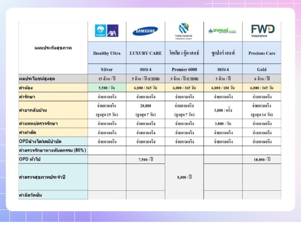 | ระยะเวลาความคุ้มครอง | สิ้นสุดตามประกันชีวิตหรือบริษัทประกันชีวิตสามารถยกเลิกการต่อสัญญาได้เช่นเดียวกัน เนื่องจากเป็นสัญญาเพิ่มเติม | สัญญาสุขภาพเป็นสัญญาหลักแบบปีต่อปี รับประกันการต่ออายุถึง 100 ปี |