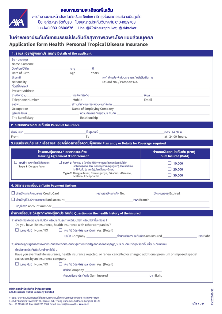 ใบคำขอ ประกันสุขภาพและอุบัติเหตุส่วนบุคคล