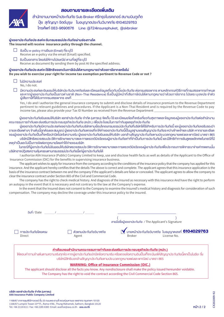 และหรือในกรณีที่ผู้เอาประกันภัยเสียชีวิตหากผู้รับผลประโยชน์ท่านใดท่านนึงไม่ต้องการรับค่าสินไหม - ใช้ในกรณีผู้เอาประกันภัยมอบอำนาจให้ทางบริษัทกระทำการขอประวัติการรักษา
